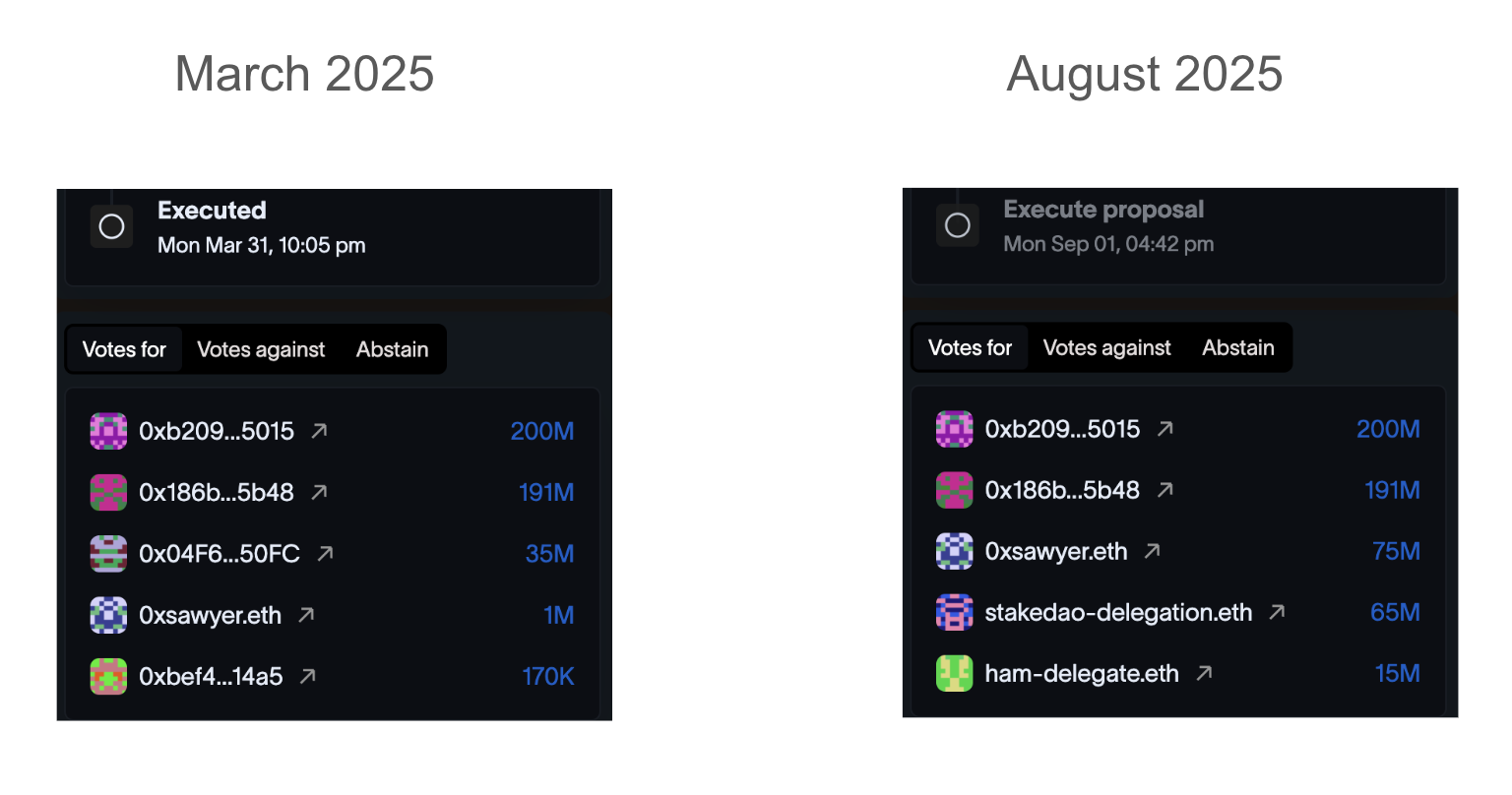 Governance diversity has not improved and in fact has eroded some compared to a year ago, raising both safety and centralization concerns. The current concentration of voters creates a “why bother” attitude in the community, as you’ll see scanning the Forums (Mallo’s post last week) and the Lodge.