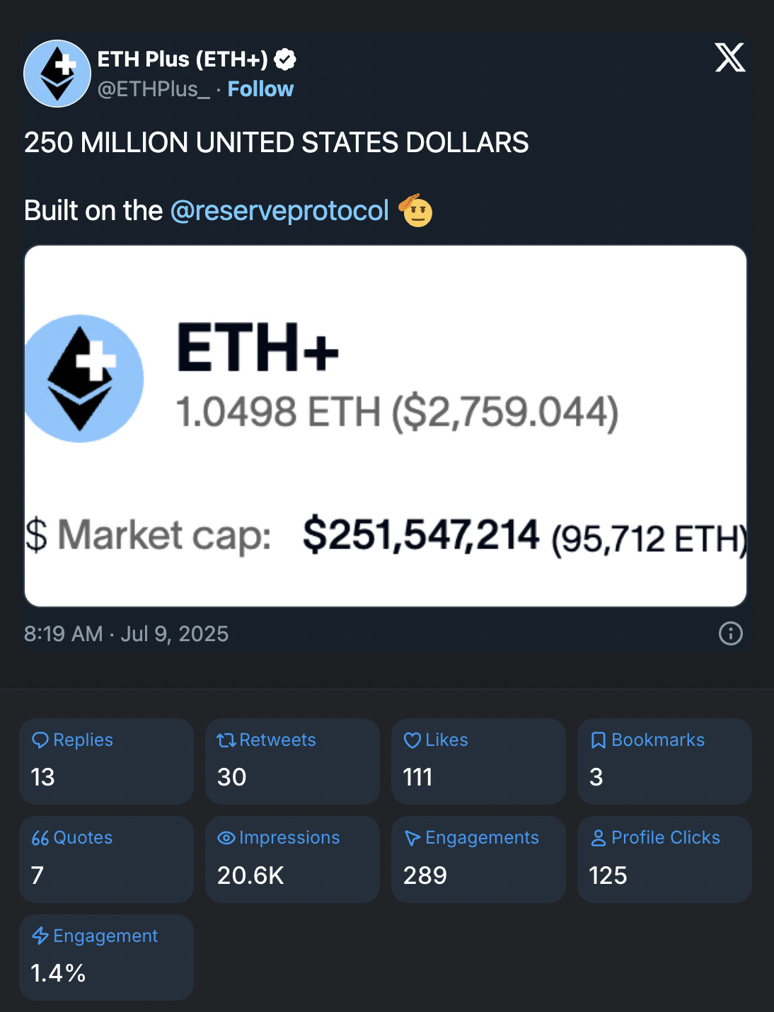 To conclude, Q3 was another period of strong growth for ETHplus across both on-chain and off-chain metrics. Core indicators such as market cap, TVL and yield advanced meaningfully, while governance discussions continued to mature around key risk considerations. Although certain secondary venues saw contractions in ETHplus supply, Morpho’s continued growth underlines its position as the primary hub of activity. On the communications side, social media performance strengthened considerably, with impressions, engagement and reach all expanding at pace. Together, these developments highlight both the current market position and scalability of ETHplus as it heads into the final quarter of the year.