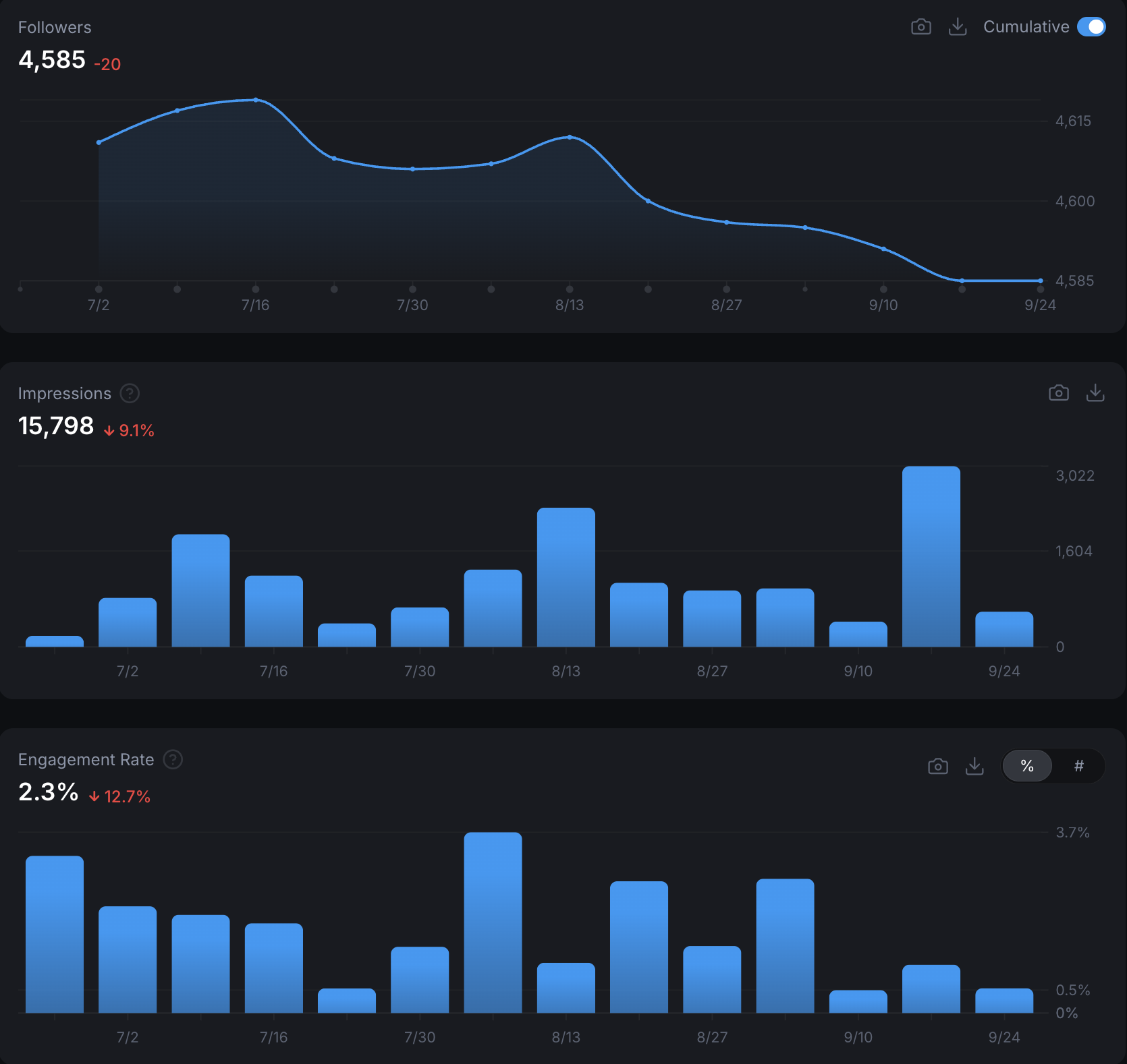 Followers | 4622 | 4,585 | -0.8% |